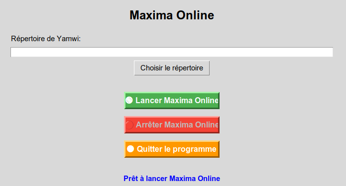 | Guide d’installation de Yamwi version 3 (sous Linux) * télécharger le fichier yamwi3.zip et le décompresser dans son répertoire personnel (dans un dossier ou un sous-dossier) * vérifier que les pré-requis sont satisfaits. Les logiciels Apache, php, Gnuplot, Maxima, timeout, dvips, texi2dvi, convert doivent être installés. * télécharger le launcher (executable Linux) : GoMaximaOnline (il s’agit d’un zip à décompresser; vérifier qu’il est bien exécutable comme programme. Il peut être décomprimé dans n’importe quel endroit du répertoire personnel. * lancer le launcher en cliquant sur GoMaximaOnline. La fenêtre ci-contre s’ouvre * choisir le dossier ou se trouvent les fichiers de yamwi (voir étape1), puis cliquer sur le bouton lancer Maxima Online. Une fenêtre du navigateur s’ouvre avec Yamwi prêt à fonctionner. * un clic sur le bouton Arrêter Maxima Online termine la session php * le dernier bouton permet de quitter le launcher. | ![]() |