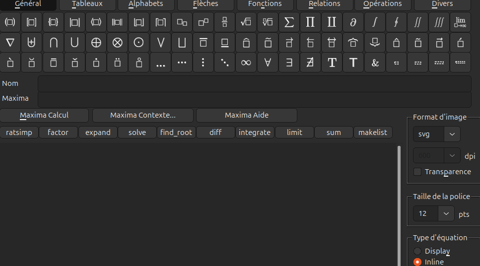 | Site Github pour le développement de l’extension : | https://github.com/michelprog59/MaximaTeXMaths |